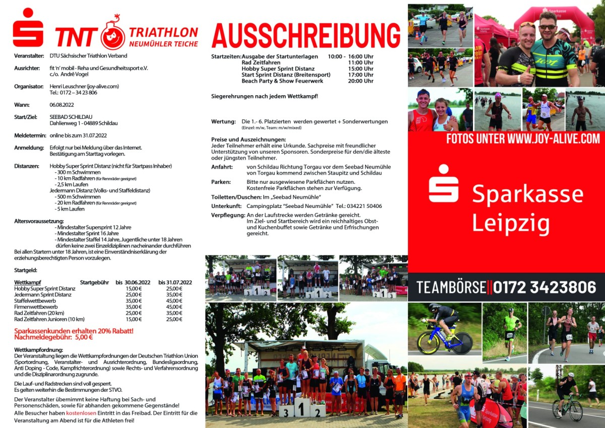 Die Anmeldung ist über die Webseite des Veranstalters möglich: Zur AnmeldungTNT Triathlon-Neumühler-Teiche : Ergebnisse, Startliste & Fotos