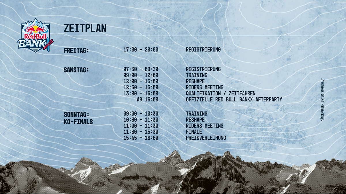 Enge Kurven, extreme Fliehkräfte und hohe Geschwindigkeit: Red Bull Bankx ist ein innovativer, actiongeladener Skiparallelslalom-Event zum Mitmachen. Am Nebelhorn in Oberstdorf messen sich zum ersten Mal Skifahrerinnen und Skifahrer in einem Banked-Parallelslalom auf zwei nebeneinander gesteckten Kursen voller Steilkurven („Banks“) sowie engen Speed-, Technik- und Sprung-Sektionen. Teilnehmen kann jeder – wer diesen Event auf dem anspruchsvollen Parcours gewinnt, ist wahrscheinlich der bzw. die kompletteste Skifahrer von heute. Eine Herausforderung voller Fun und Action, unter den Augen der deutschen Riesenslalom-Olympiasiegerin Viktoria Rebensburg, die als Expertin und Vorläuferin vor Ort mit dabei sein wird!