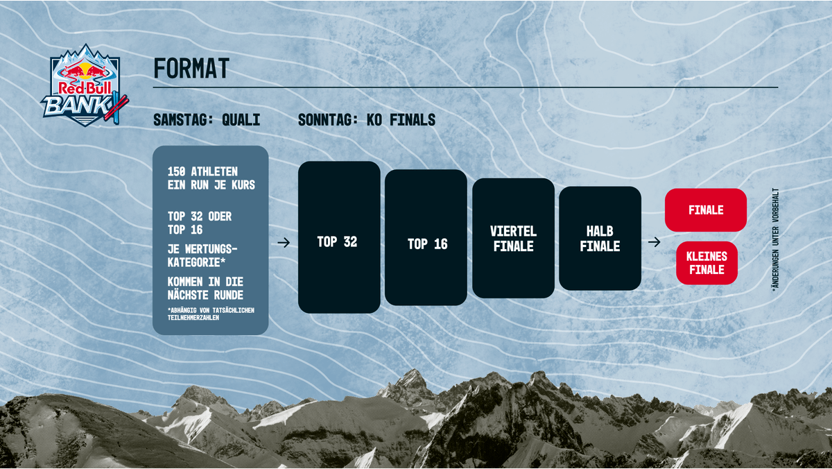 Maximal 150 Teilnehmer:innen gehen am Samstag, in die Qualifikation für das Finale, das am 5. März ausgetragen wird. In der Ausscheidungsrunde am Samstag starten die Skifahrer:innen einzeln gegen die Uhr: Sie absolvieren zwei Runs und fahren dabei jeden Track einmal; beide Zeiten werden addiert. Die jeweils schnellsten 16 oder 32 Damen und Herren (Anzahl abhängig von tatsächlicher Teilnehmerzahl) qualifizieren sich für die K.o.-Finals. Dort folgen dann am Sonntag spannende Eins-gegen-Eins-Duelle mit jeweils zwei Runs pro K.o.-Runde im Parallel-Parcours, bis nach dem Finale die Siegerin und der Sieger feststehen. Da beide Tracks nicht zu einhundert Prozent identisch sein können, fahren die Teilnehmer:innen in den Finalrunden jeweils beide Tracks, um völlige Chancengleichheit zu gewährleisten.
